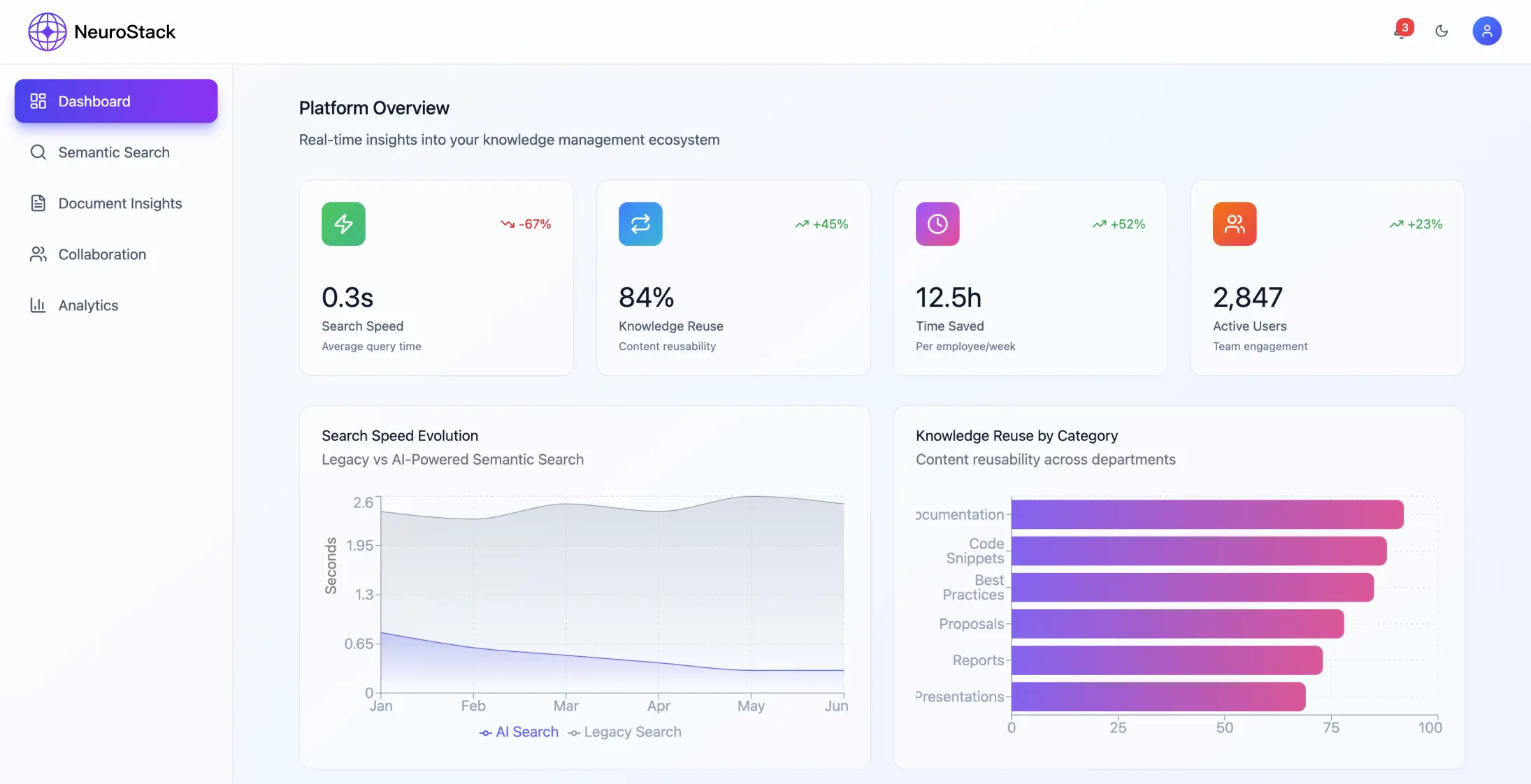 Los trabajadores del conocimiento suelen manejar información dispersa entre diferentes herramientas y plataformas. Esto conduce a una disminución de la productividad y a esfuerzos de trabajo redundantes. Hemos desarrollado una plataforma de gestión del conocimiento basada en inteligencia artificial que revoluciona la forma en que las organizaciones manejan y recuperan la información mediante el procesamiento del lenguaje natural y la curación inteligente de contenidos.