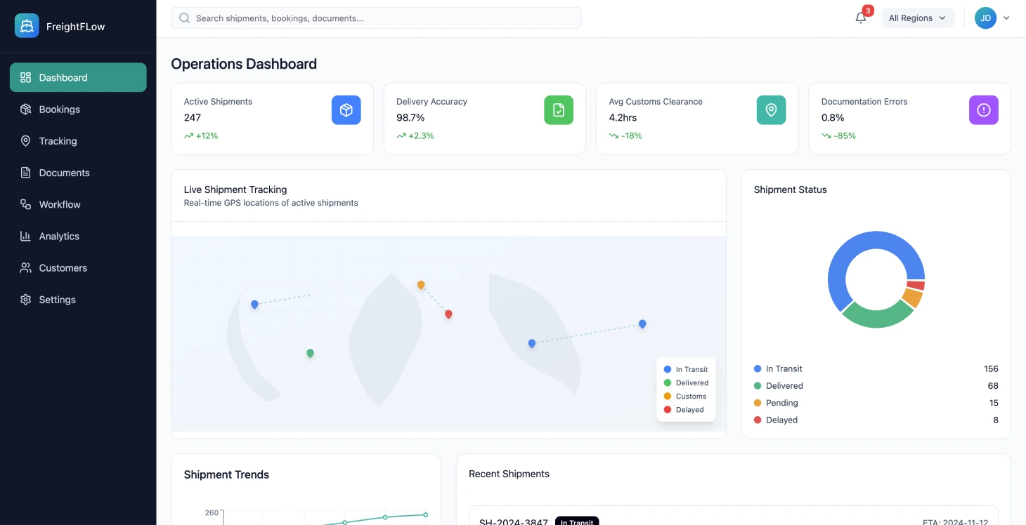 - Envío de notificaciones de estado Los motores de flujo de trabajo personalizables permiten adaptarse a diferentes rutas comerciales y tipos de servicio sin necesidad de modificar el código. La arquitectura de transmisión de eventos permitió un rápido seguimiento de los envíos al combinar los datos de las fuentes EDI de los transportistas, los sensores IoT y las actualizaciones manuales para el procesamiento de la información casi en tiempo real. Se logró un informe de estado coherente en los diferentes sistemas de transportistas y formatos de datos mediante la normalización de datos. Las capacidades de autoservicio permitieron a los clientes reservar envíos y rastrearlos directamente sin necesidad de ayuda del personal para las tareas rutinarias. El diseño adaptado a dispositivos móviles facilitó a los equipos de almacén y transporte el acceso a la información sobre el terreno.